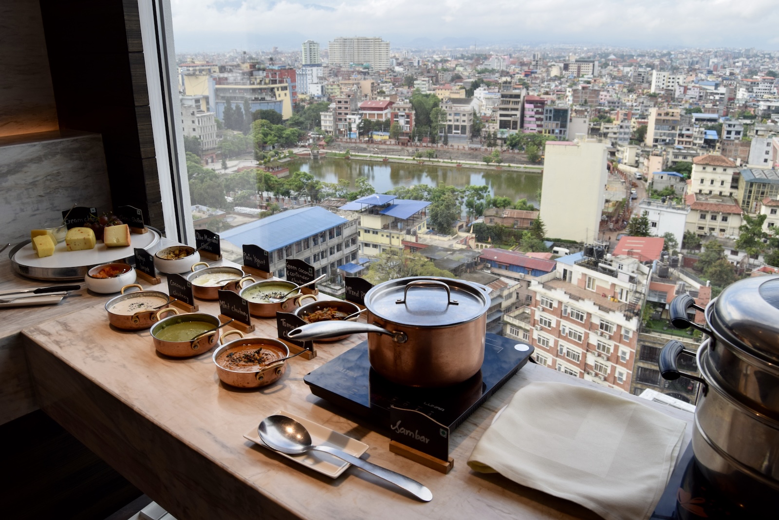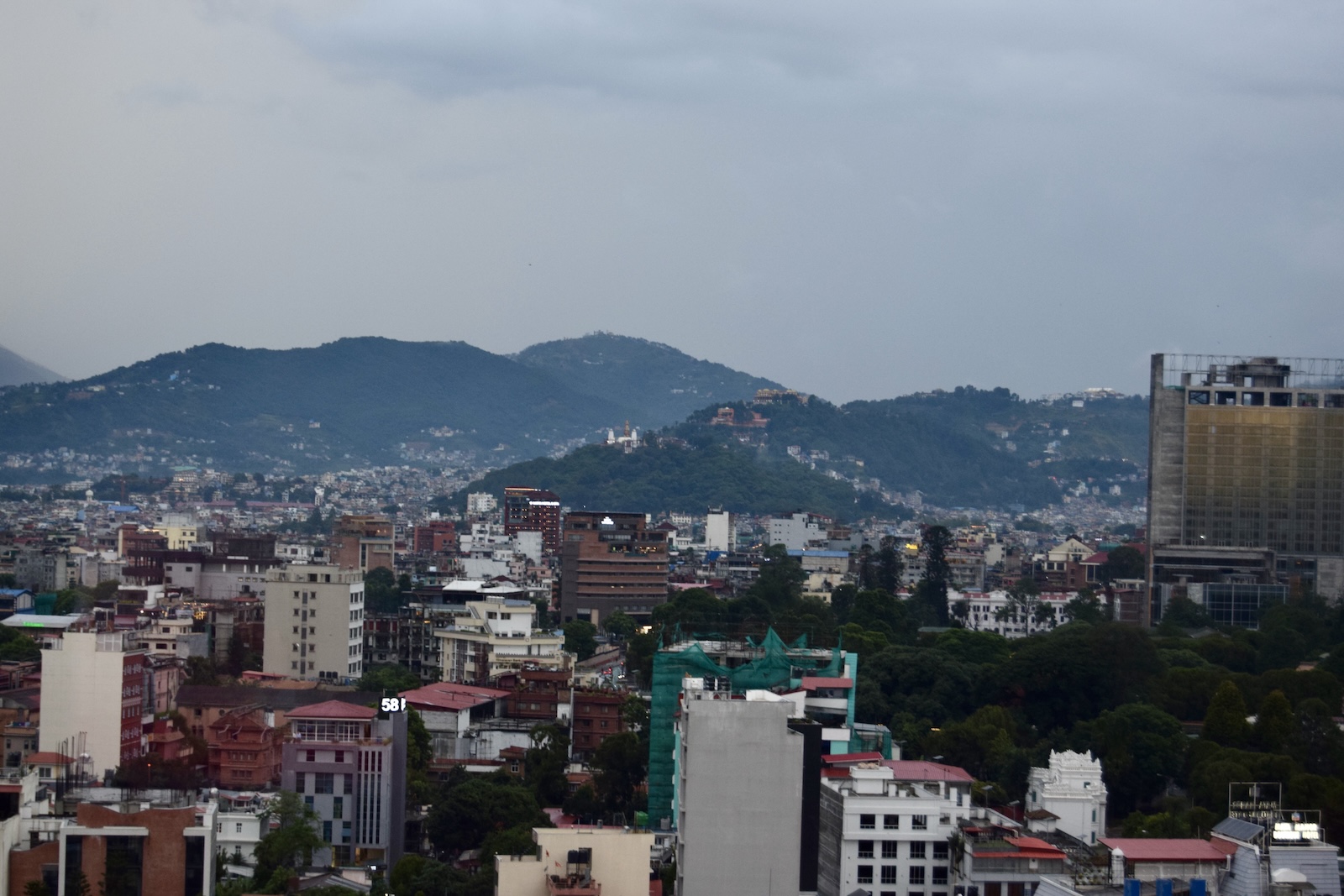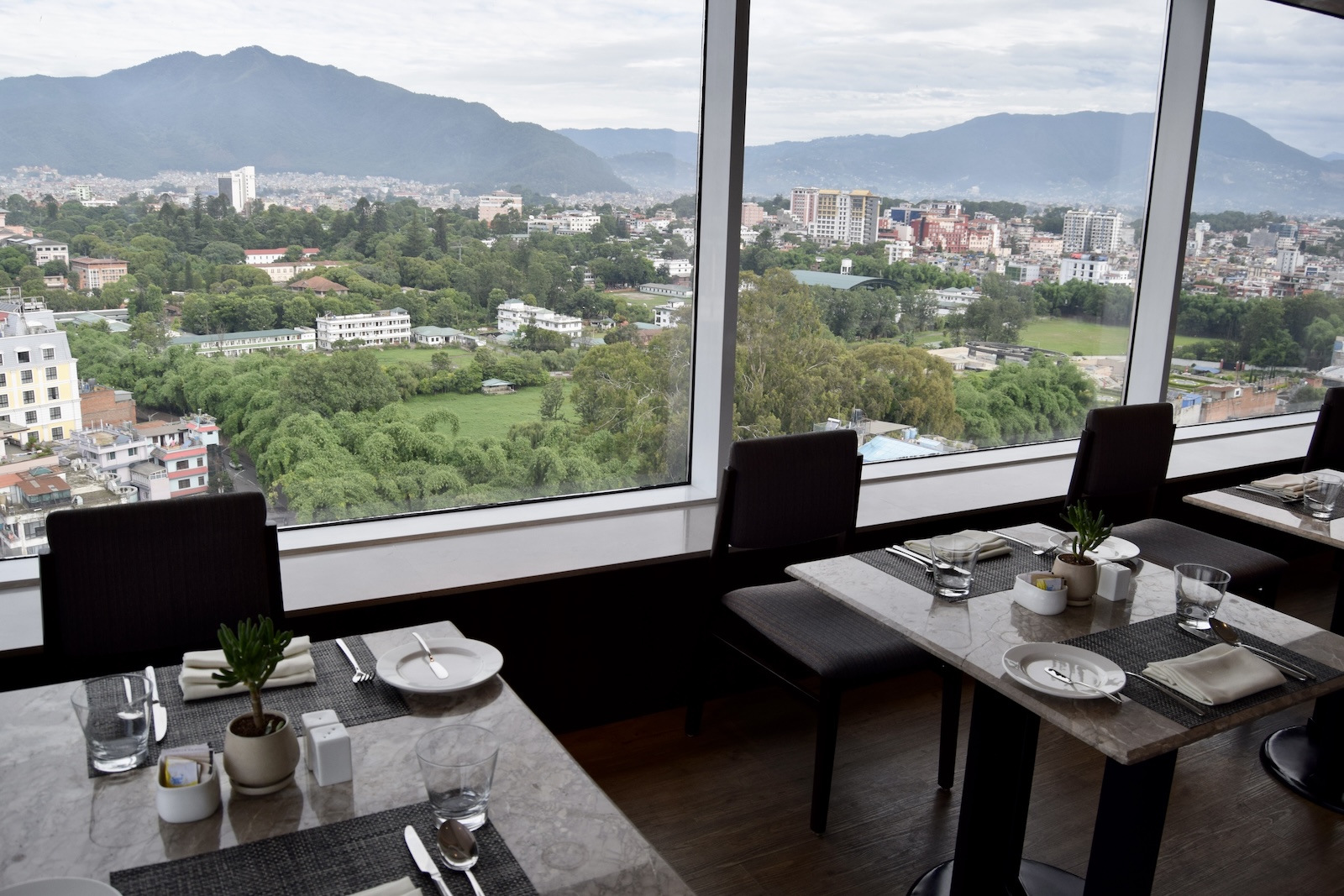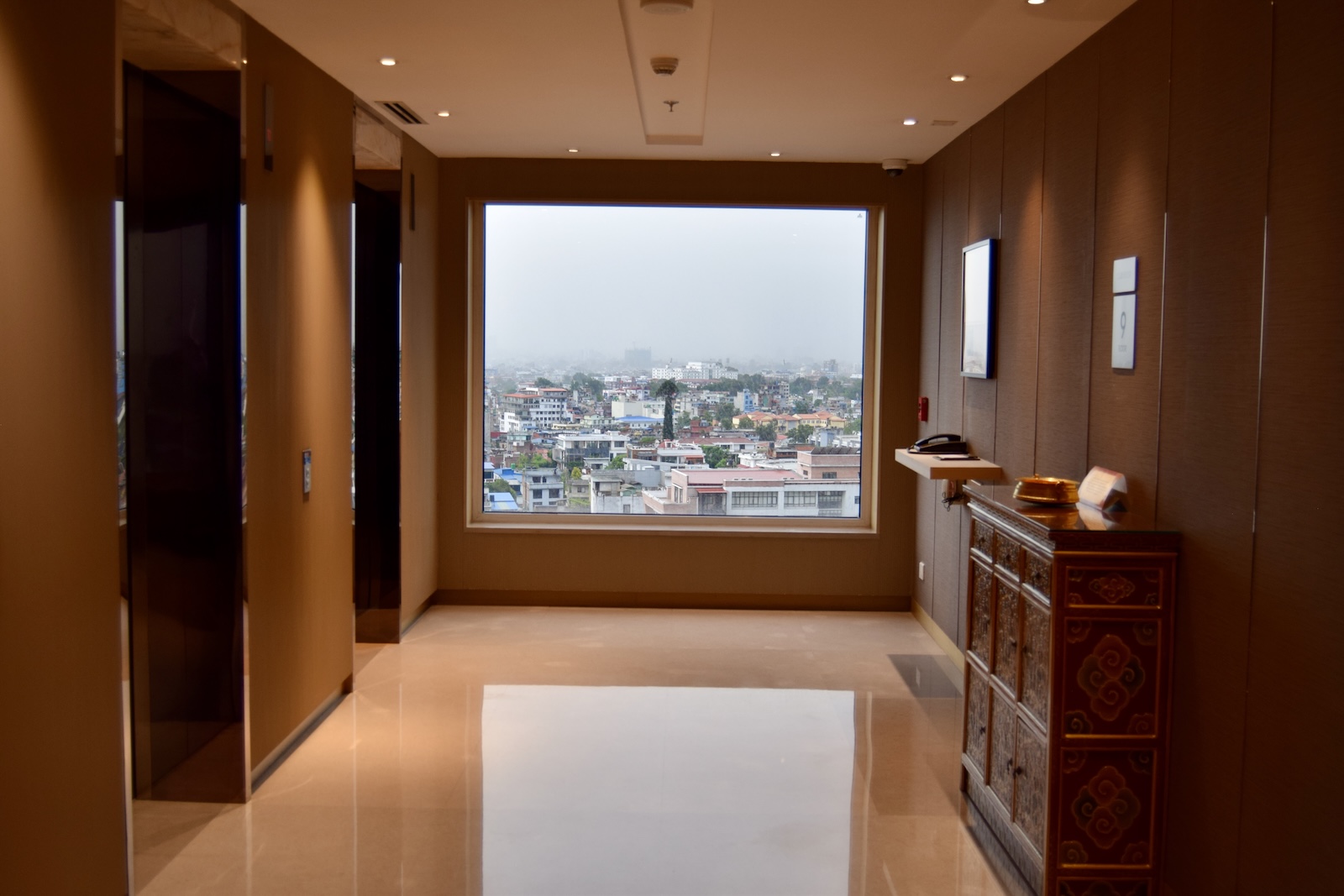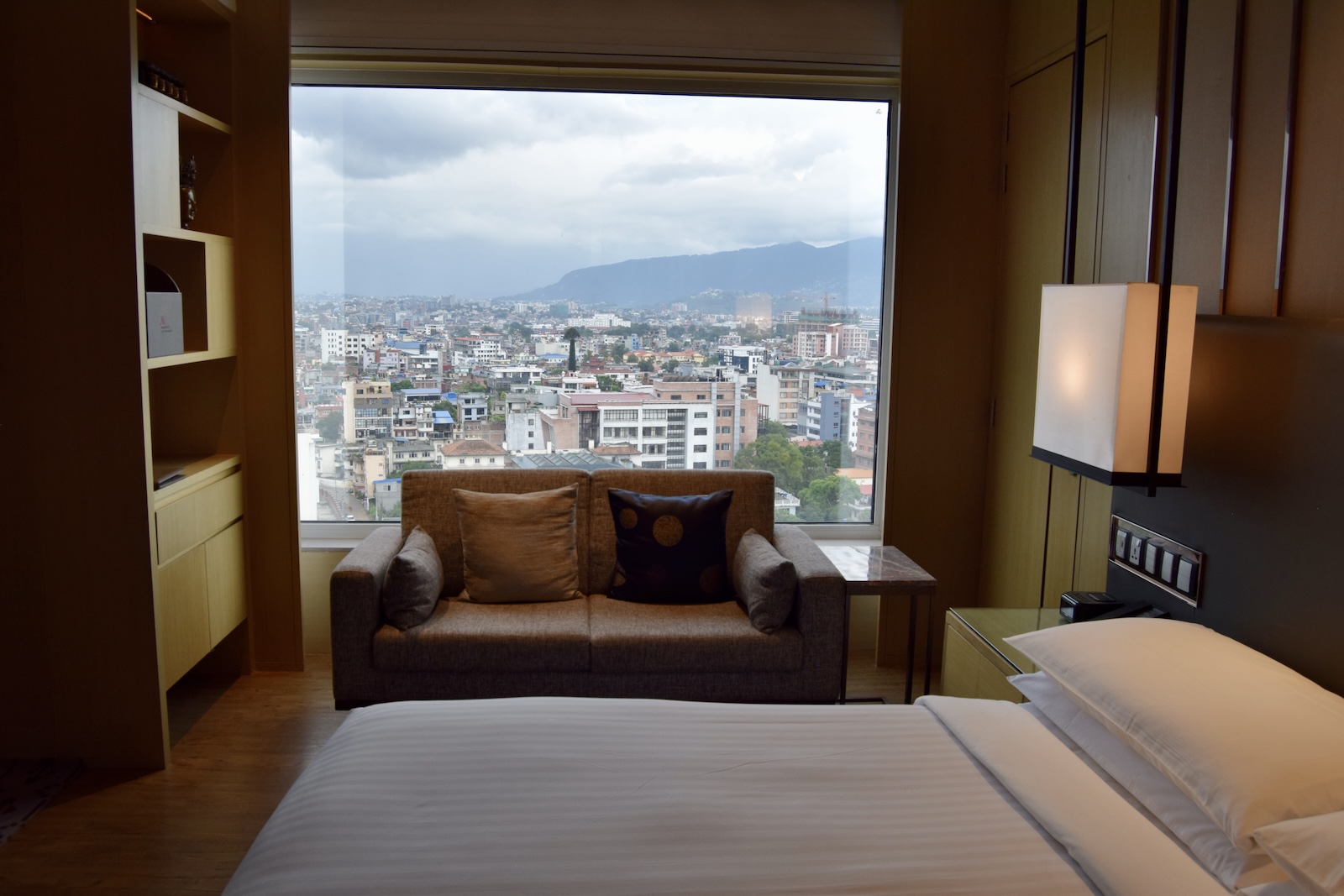 Für diese erdbebengefährdete Zone von Kathmandu ist das Marriott schon ein sehr hohes Gebäude. Damit liegt einem die Stadt vor den Füßen. Baulich mussten sie aber deswegen sehr starke Träger und Säulen einbauen. Das hat mich ein wenig an das auch erdbebengefährdete Ritz-Carlton in Almaty (Review) erinnert.