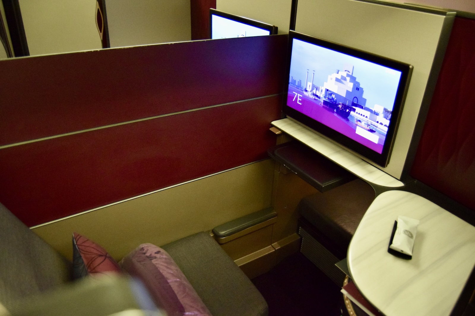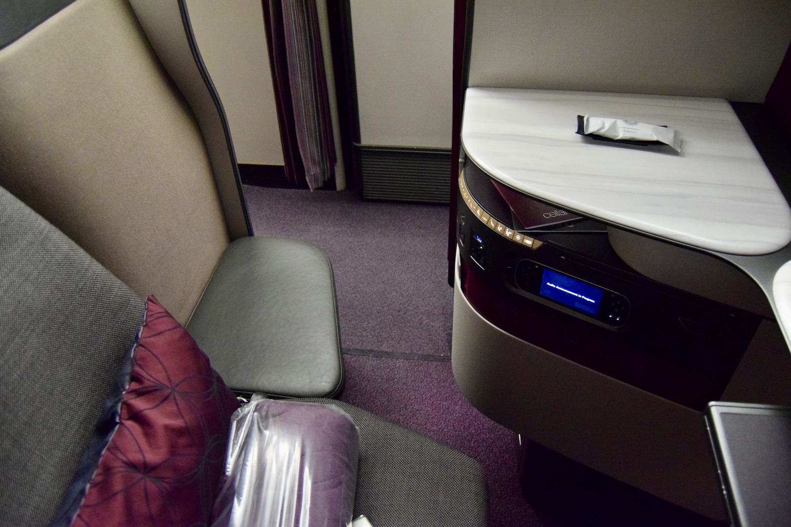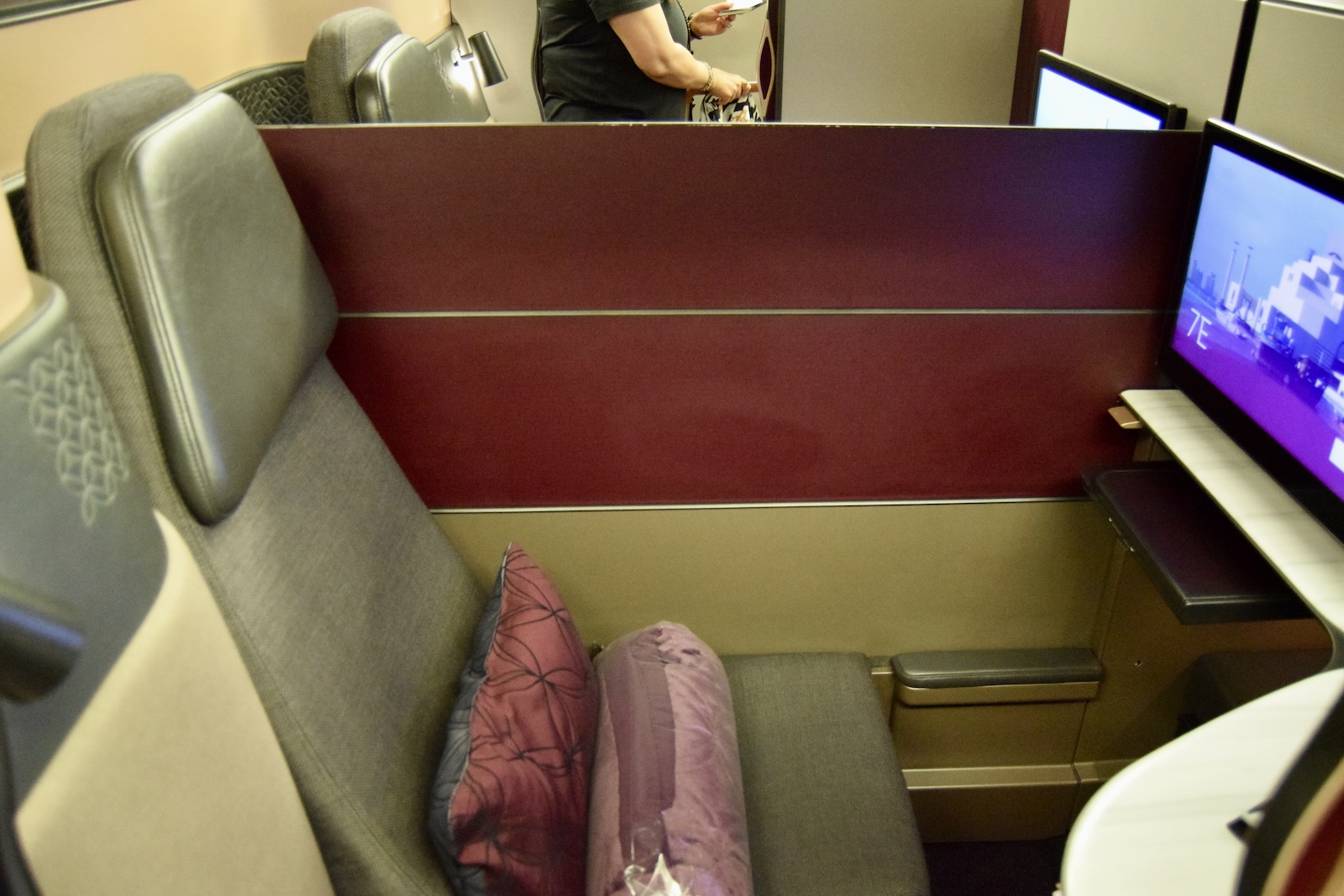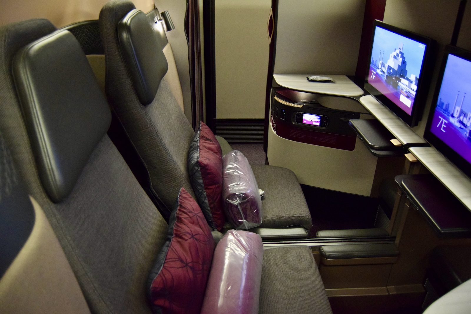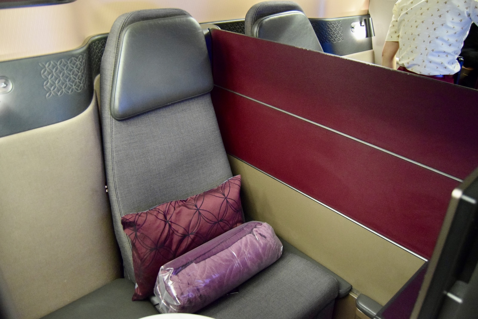 Meine eigentlichen Sitzplätze am Fenster gab es ja nicht. Dafür hat man mich in diese Honeymoon Sitze in der zweiten Kabine platziert. Schaltet man die zwei Plätze zusammen, kann man die Abtrennung komplett senken und mit einem dafür vorgesehenen langen Kissen eigentlich eine Art Doppelbett erzeugen. Da kommt schon ein Platzgefühl wie in einer First Class auf. Qsuite würde ich noch immer als einen der marktführenden Sitze in einer Business einordnen.