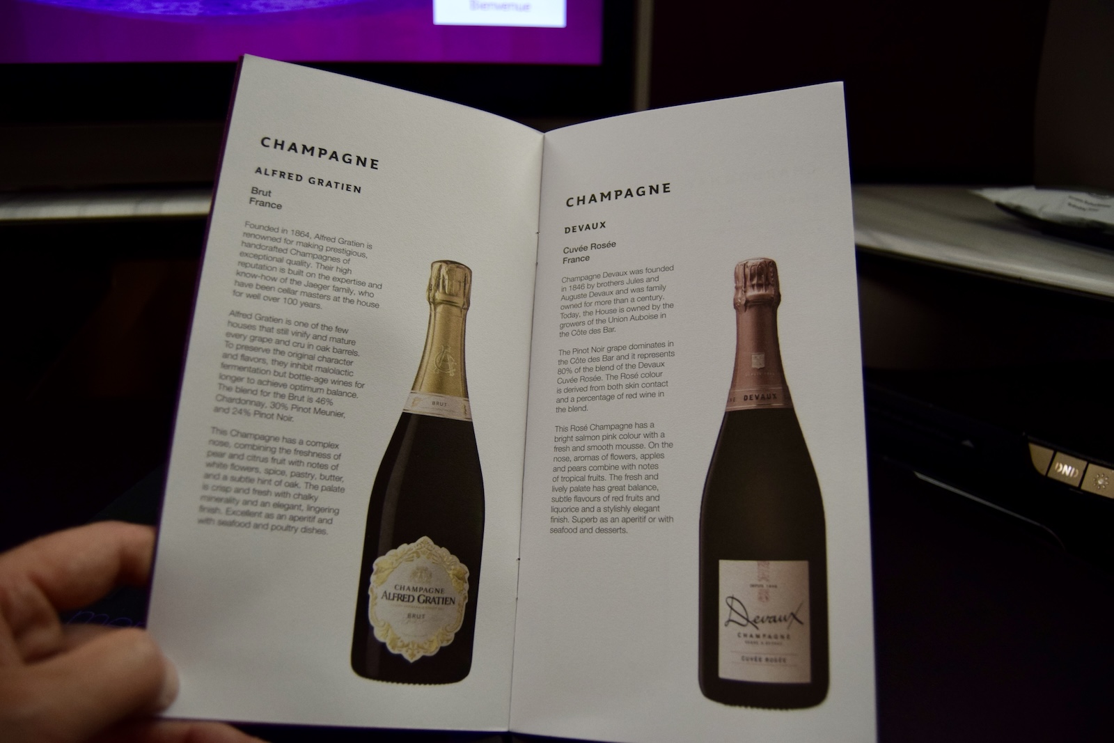 Kissen und Decke haben gemeinsam mit einem parfürmierten Erfrischungstuch gewartet. Die Flugbegleiter haben Speise- und Getränkekarte ausgeteilt. Leider hat Qatar Airways auf Champagner am Boden verzichtet. Natürlich wurden die Essenswünsche bereits vor Abflug aufgenommen. Wie wir das von den guten Airlines kennen hat man mit einem digitalen System mit Tablets gearbeitet. Die Managerin des Fluges hat sich auch vorgestellt.