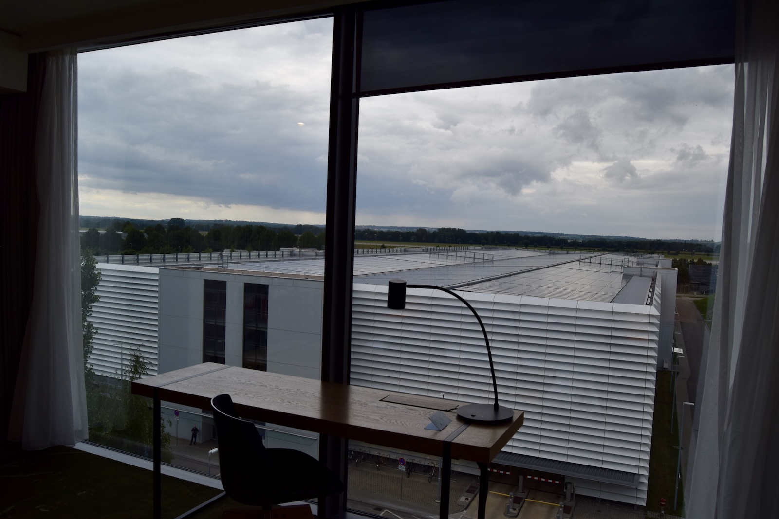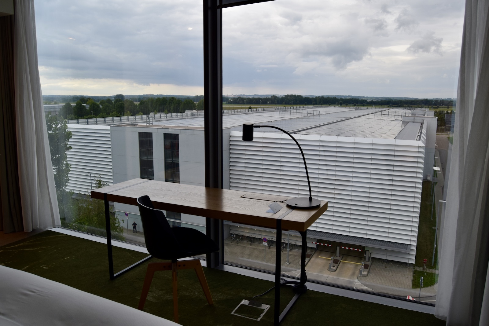 Diese Executive Runway View Zimmer befinden sich am Ende des einen Gebäudes des Hiltons und blicken mit einer enormen Fensterfront über Dächer wirklich bis rüber zur Start- und Landebahn. Also über die Aussicht brauchen wir überhaupt nicht diskutieren. Die kann schon was. Natürlich gibt es Airport Hotels die noch ein wenig dichter am Geschehen positioniert sind. Auch im Hilton am Flughafen München kann man im Bett liegen und das Treiben des Airports ist die Kulisse des Zimmers.