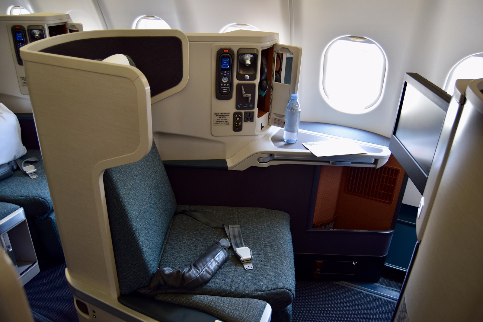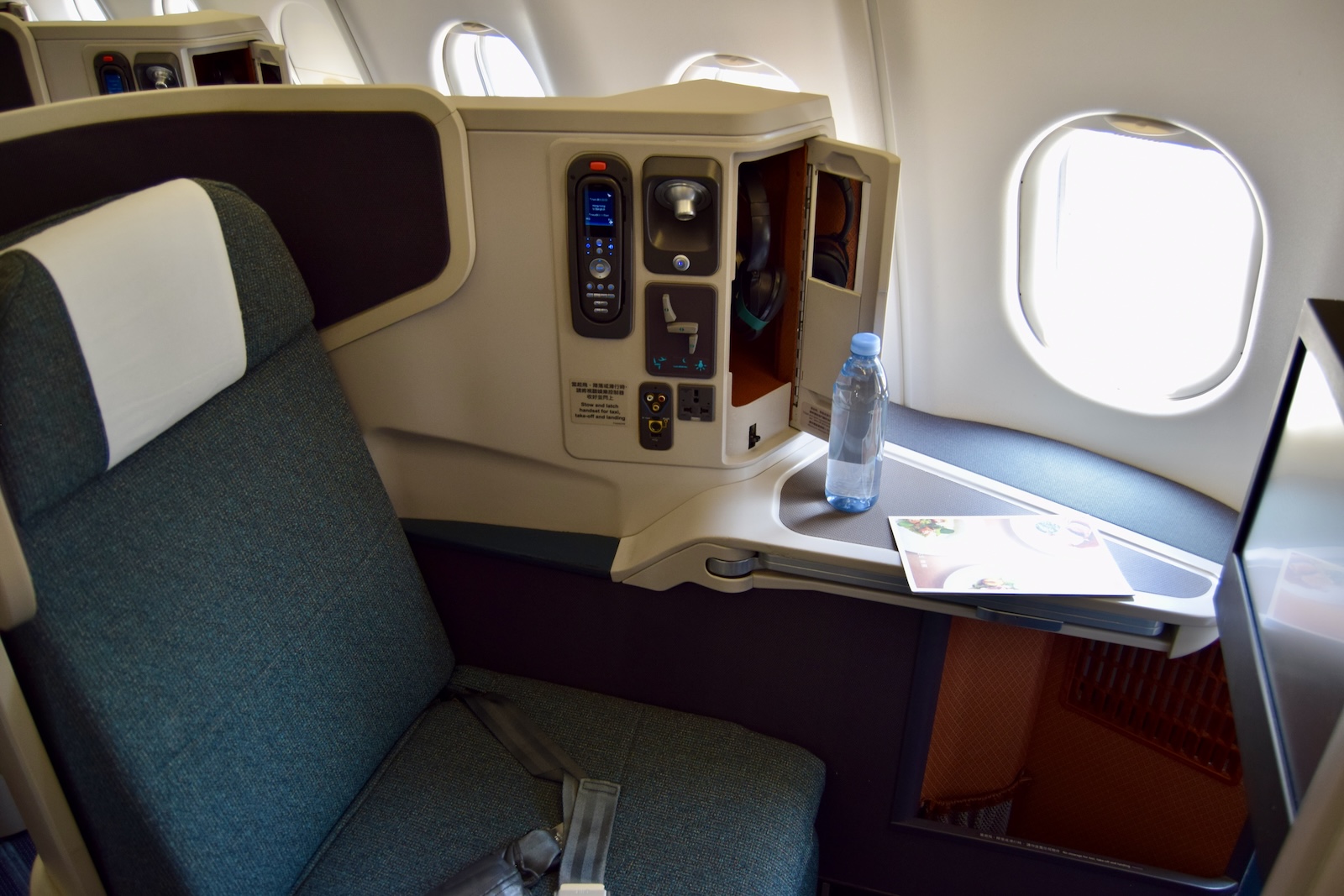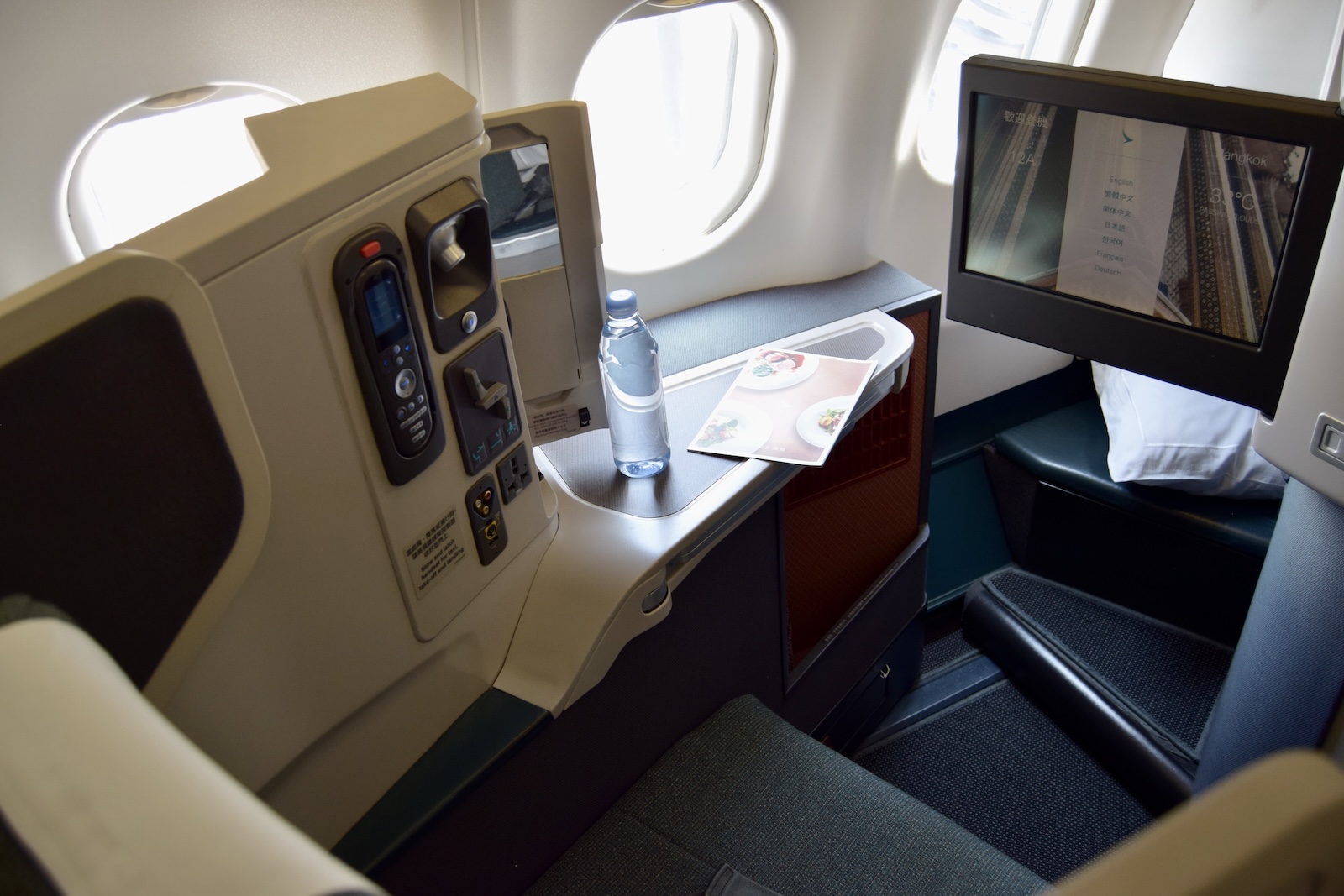 Cathay Pacific muss man für den Einsatz einer ordentlichen fully-flat Business auf diesen regionalen Strecken sehr loben. Man kann aber auch relativ einfach auf einmal in einer Recliner Business in 2-3-2 landen. Da ist die Bandbreite des Produkts sehr groß und sie haben keine Hemmungen einfach wild die Business Varianten zu wechseln.