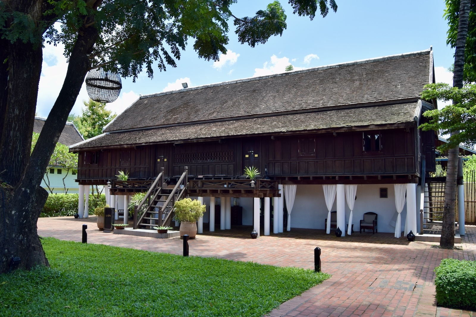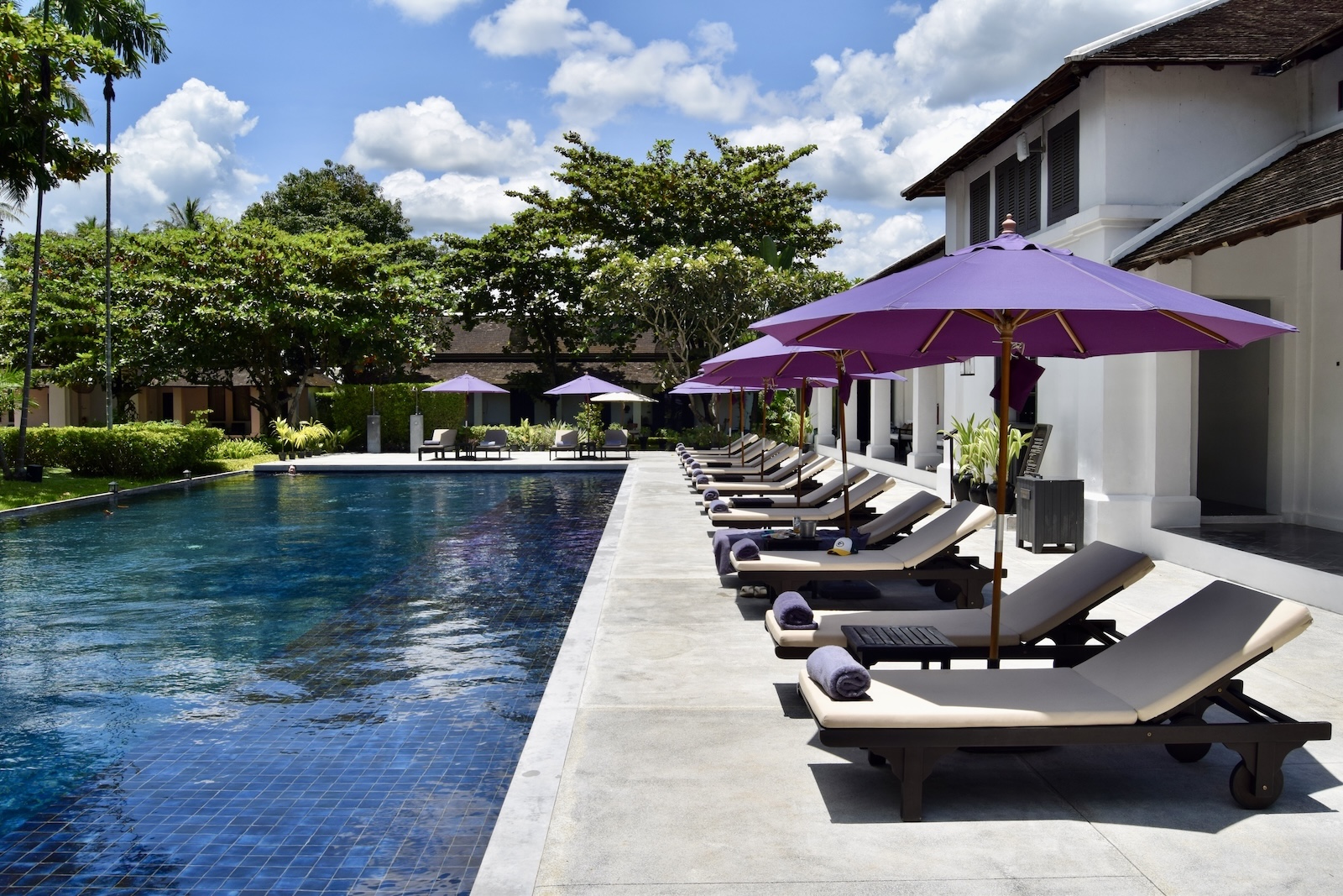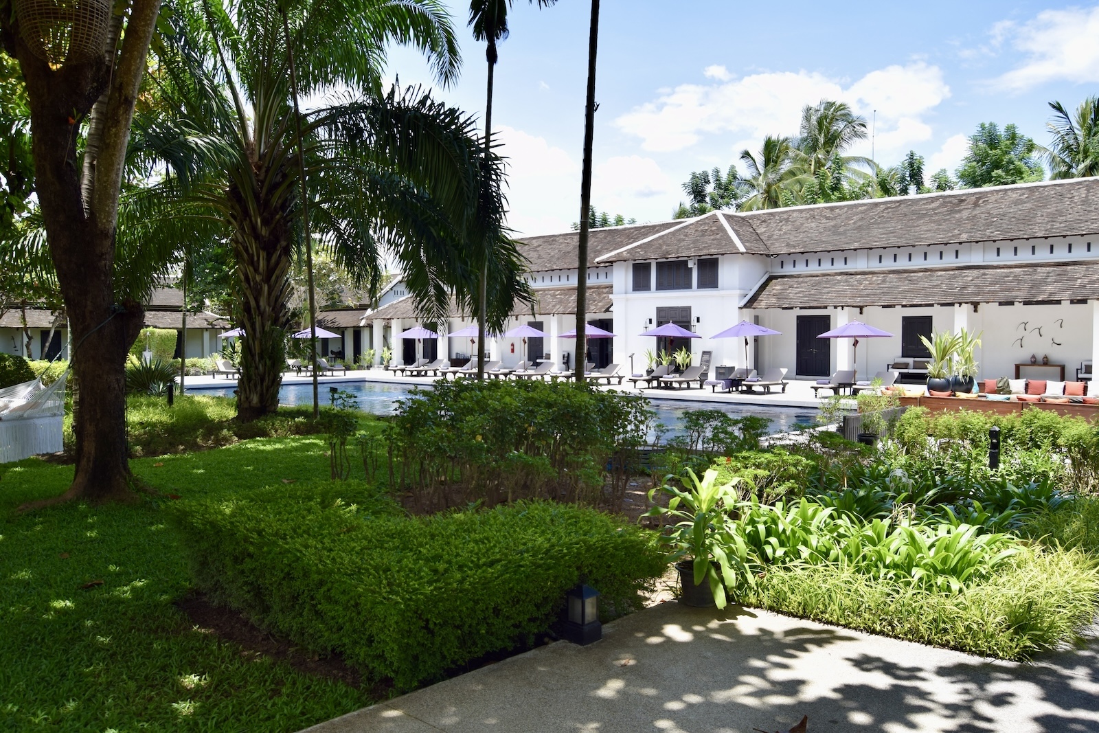 Ganz grandios fand ich die Anlage. Der Pool ist wunderschön und hier kommt richtig so koloniales Feeling auf. Wegen dem Kolonialthema der Stadt fährt man ja nach Luang Prabang. Der Garten mit den Suiten ist so eine richtig schöne Luxusoase.