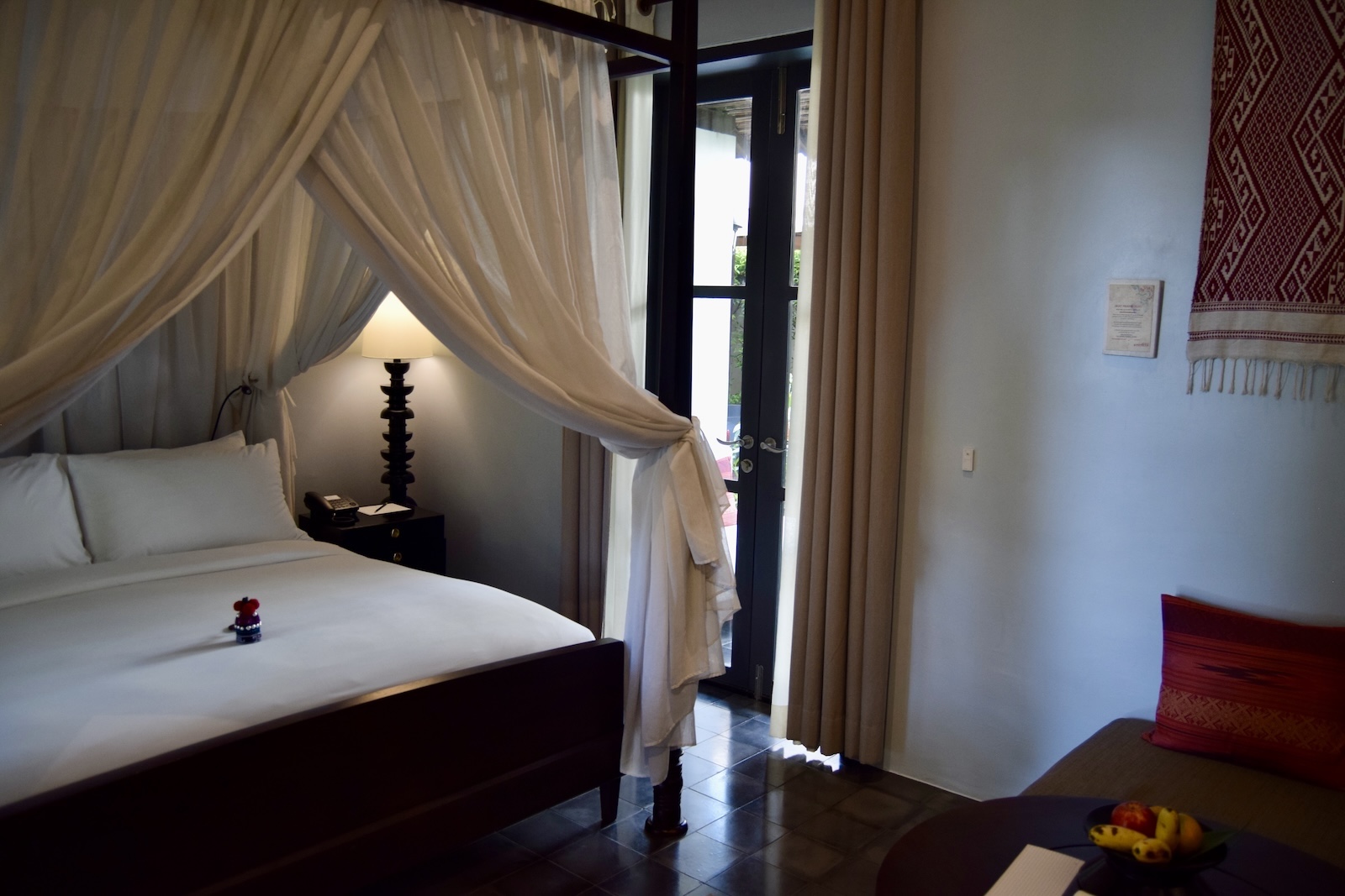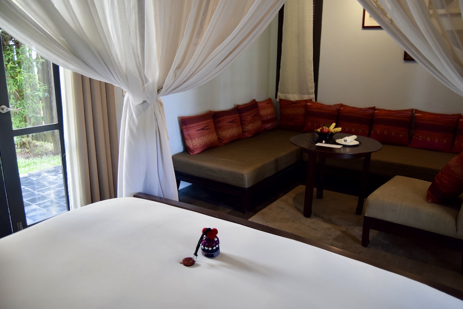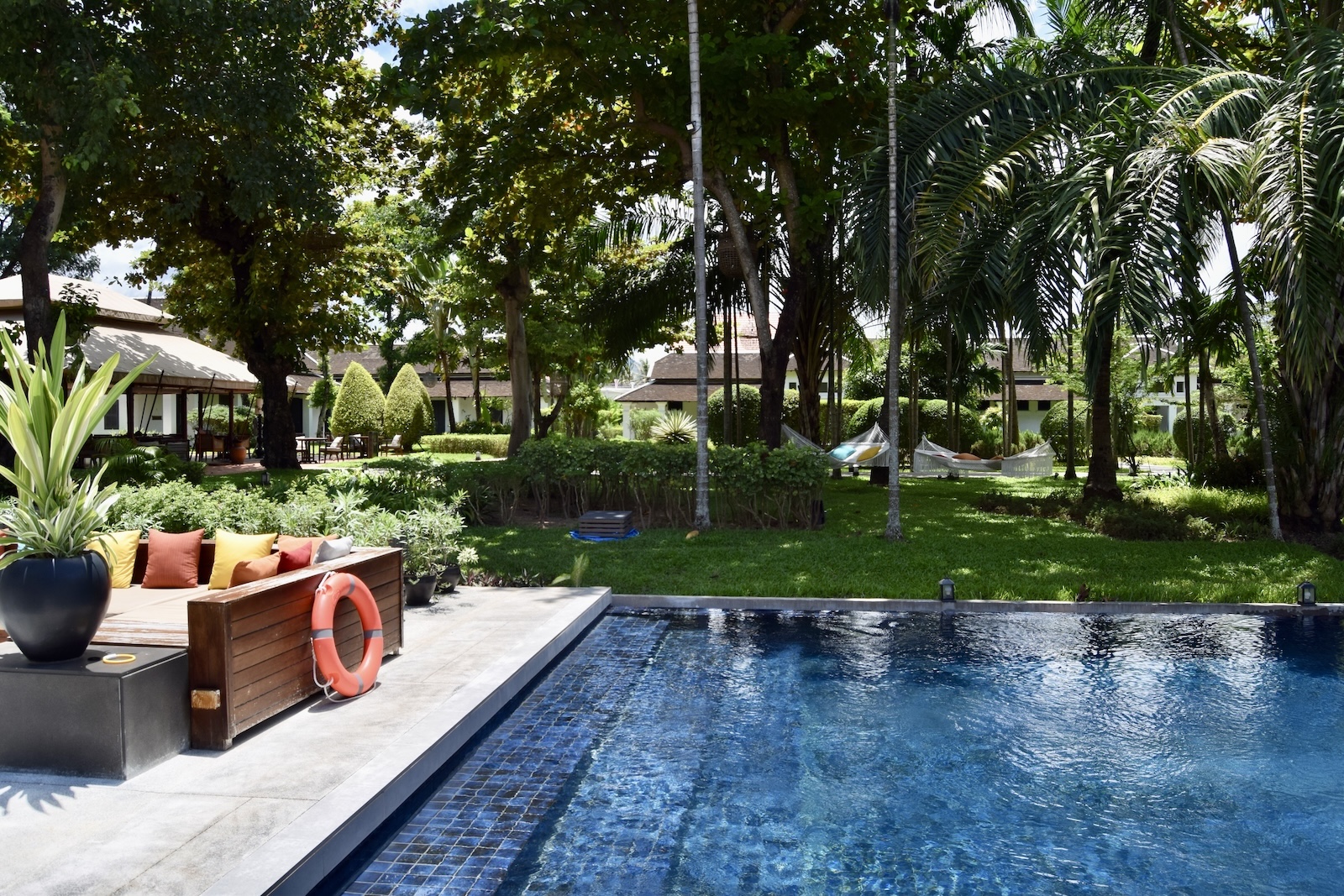 Ganz grandios fand ich die Anlage. Der Pool ist wunderschön und hier kommt richtig so koloniales Feeling auf. Wegen dem Kolonialthema der Stadt fährt man ja nach Luang Prabang. Der Garten mit den Suiten ist so eine richtig schöne Luxusoase.